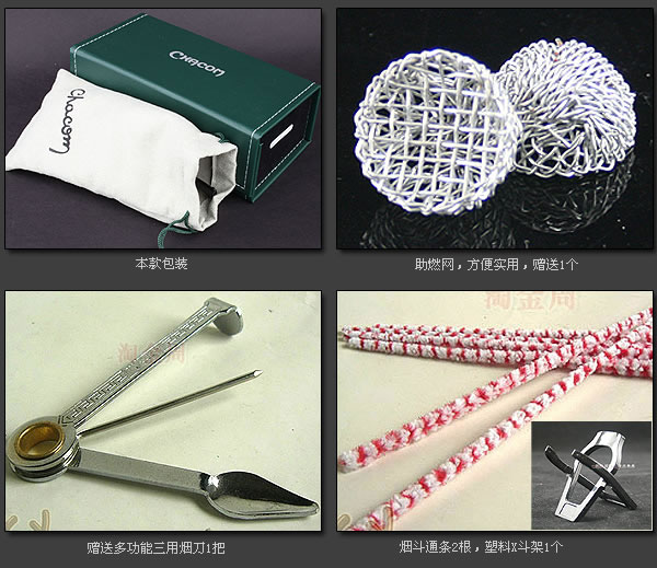 配件:送三用烟刀1把,塑料x斗架1个,过滤芯1包,助燃网1个,通条2根