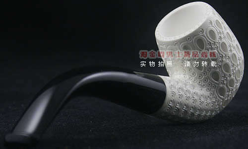 海泡石(meerschaum) 德语“海泡沫”的意思,传说是由海浪头的白沫凝成.海泡石是一种珍贵的多孔矿物,主要成分为含水硅酸镁(magnesium silica),是自然界中最具渗透性的物质之一,由数百万年前,海中微生物的躯壳沉积洋底,石化而成。海泡石是一种极轻质,吸收性极佳的特殊天然材料。最优质、最适合用于烟斗制作的海泡石原料,产自土耳其伊斯坦布尔东南约200英里,名为eskisehir的小村庄附近。工人深入地底约400英尺采挖,过程艰辛。经历多重 筛选、去杂工序,并由熟练工匠精心雕琢,方成就做工精致细巧的精品烟斗和烟嘴。