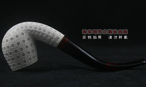 海泡石(meerschaum) 德语“海泡沫”的意思,传说是由海浪头的白沫凝成.海泡石是一种珍贵的多孔矿物,主要成分为含水硅酸镁(magnesium silica),是自然界中最具渗透性的物质之一,由数百万年前,海中微生物的躯壳沉积洋底,石化而成。海泡石是一种极轻质,吸收性极佳的特殊天然材料。最优质、最适合用于烟斗制作的海泡石原料,产自土耳其伊斯坦布尔东南约200英里,名为eskisehir的小村庄附近。工人深入地底约400英尺采挖,过程艰辛。经历多重 筛选、去杂工序,并由熟练工匠精心雕琢,方成就做工精致细巧的精品烟斗和烟嘴。