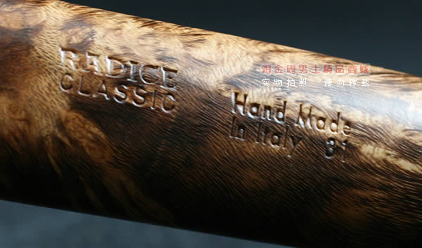 Radice烟斗向来对细节十分注重,在经典设计和烟斗外形方面都很特别。Liugi的设计始终充满创意,即使他的儿子们Gianluca和Marzio进入工作室后也是如此。他们使用最好的石楠木材质,经过3到6年的风干后,才使用。口柄通常使用透明的玻璃树脂制作。进来他们应一些顾客的要求,还使用高质量的硬橡皮材质制作口柄。