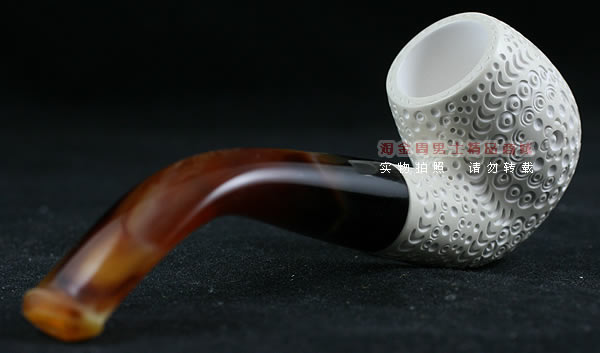 海泡石(meerschaum) 德语“海泡沫”的意思,传说是由海浪头的白沫凝成.海泡石是一种珍贵的多孔矿物,主要成分为含水硅酸镁(magnesium silica),是自然界中最具渗透性的物质之一,由数百万年前,海中微生物的躯壳沉积洋底,石化而成。海泡石是一种极轻质,吸收性极佳的特殊天然材料。最优质、最适合用于烟斗制作的海泡石原料,产自土耳其伊斯坦布尔东南约200英里,名为eskisehir的小村庄附近。工人深入地底约400英尺采挖,过程艰辛。经历多重 筛选、去杂工序,并由熟练工匠精心雕琢,方成就做工精致细巧的精品烟斗和烟嘴。