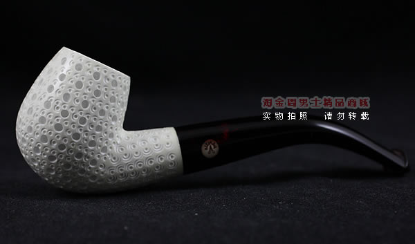 海泡石(meerschaum) 德语“海泡沫”的意思,传说是由海浪头的白沫凝成.海泡石是一种珍贵的多孔矿物,主要成分为含水硅酸镁(magnesium silica),是自然界中最具渗透性的物质之一,由数百万年前,海中微生物的躯壳沉积洋底,石化而成。海泡石是一种极轻质,吸收性极佳的特殊天然材料。最优质、最适合用于烟斗制作的海泡石原料,产自土耳其伊斯坦布尔东南约200英里,名为eskisehir的小村庄附近。工人深入地底约400英尺采挖,过程艰辛。经历多重 筛选、去杂工序,并由熟练工匠精心雕琢,方成就做工精致细巧的精品烟斗和烟嘴。