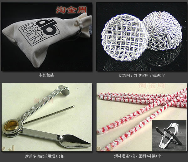 配件:送三用烟刀1把,塑料x斗架1个,过滤蕊1包,助燃网1个,通条2根