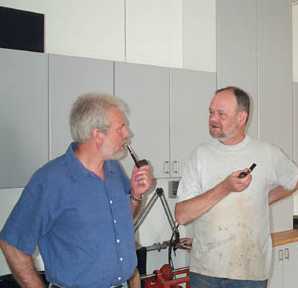 在年产量 500 把烟斗的总数中,大概有 50 把是被销售到美国的,还有 10% 的烟斗是代表了其中的最高水平。许多在欧洲范围内销售的斗都被标上等级,但是也有些在美国销售的斗在美国被标上等级。美国烟斗有生产年份,制作者和产品编号。但是这个编号并不是代表等级的。这个号码只是起着类似烟斗的身份证之类的作用。比如,被标上 PH9736 的斗意味着这把斗是制作大师韩森在1997 年制作的第 36 把烟斗。到了 1998 年,这个编号又将随之改变。选择那些极品烟斗到美国,包括那些喷沙斗,是我们的一个销售策略。”奥尔夫这样说道。所有的 S.Bang 烟斗都是高品质的,但是有些被销售到德国的烟斗却运气极差。那些烟斗被插入 9 毫米的滤芯,因为这个是德国传统的受欢迎的烟斗,如果一个烟斗没有滤芯,那就代表这个烟斗在德国很难被销售出去。这两位大师说到这个地方的时候都显的有些激动。 |   |